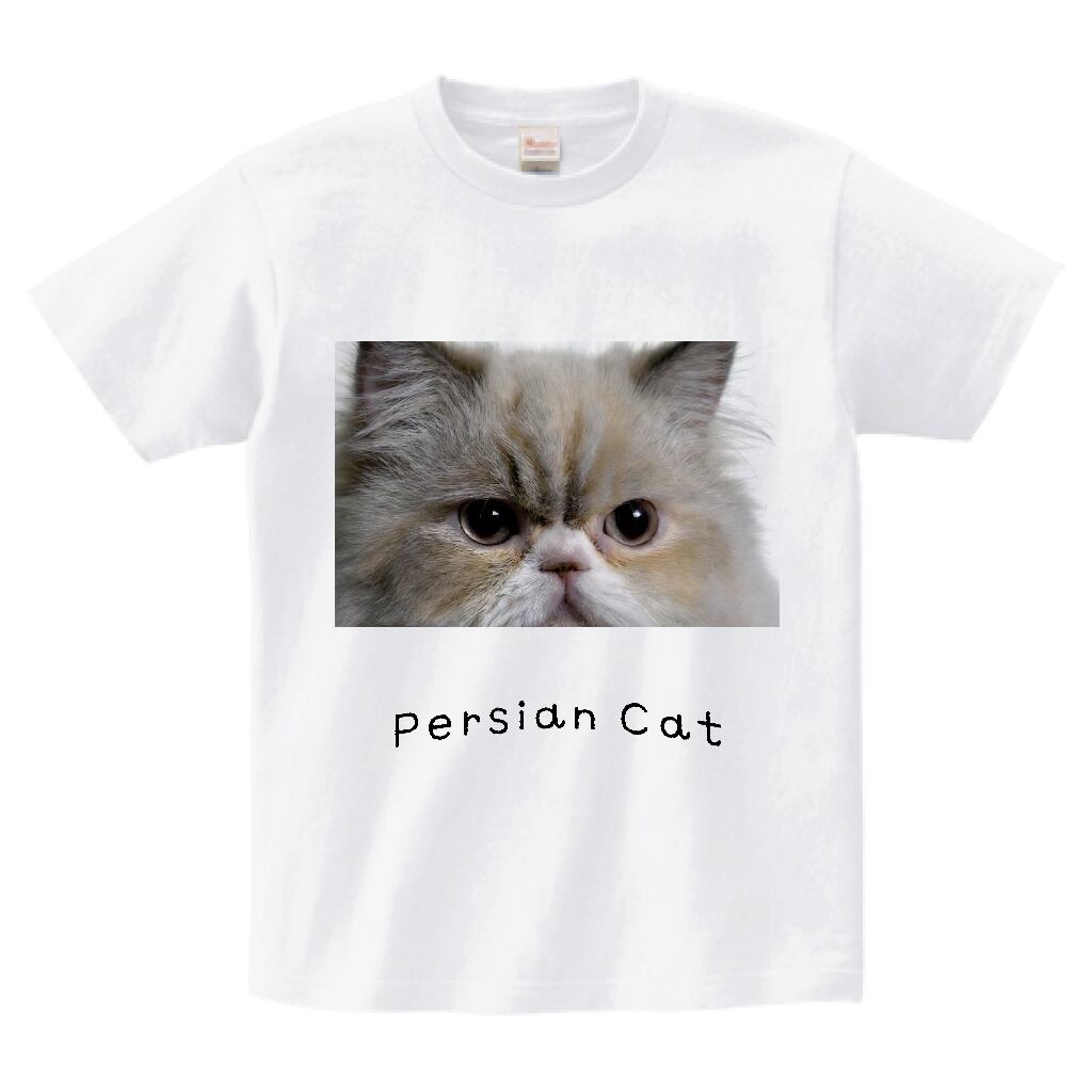 少し不機嫌そうな可愛い表情と黒の「persian Cat」文字がポイント。白ボディに映えるボリューム感のあるデザインで、猫好きさんに人気の癒し系一枚です。